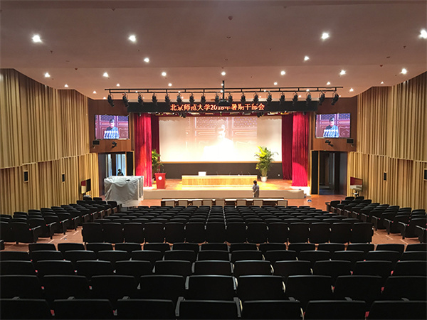 小報(bào)告廳同樣做為北京師范大學(xué)新校區(qū)舉行國際性會議、高端學(xué)術(shù)交流的場所,功能上與大報(bào)告廳基本相同,只是房間略小。根據(jù)小報(bào)告廳的功能要求,對小報(bào)告廳進(jìn)行詳細(xì)設(shè)計(jì),整體由擴(kuò)聲系統(tǒng)、視頻顯示系統(tǒng)、無線會議系統(tǒng)、同聲傳譯系統(tǒng)、會議攝錄播系統(tǒng)、視頻會議系統(tǒng)、分布式管理系統(tǒng)、舞臺燈光系統(tǒng)、信息發(fā)布系統(tǒng)和其他周邊共同組成。